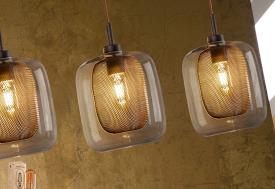 Lampe réalisée en métal laqué, couleur chocolat. Double tulipe, intérieur en maille métallique et extérieur en verre.