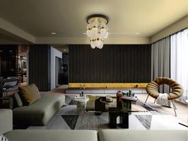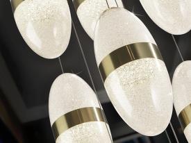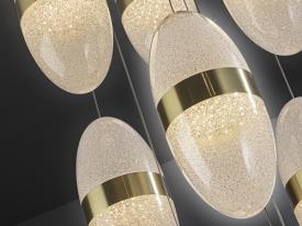 Lampe 9 LED, en métal avec finition noire et dorée. Tulipe sphérique Ø15 cm. en polycarbonate avec intérieur texturé et anneau métallique en laiton. Hauteur réglable. LED DE 54 W. 3.000 K. 4.621lm.