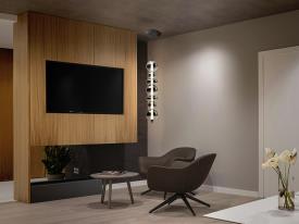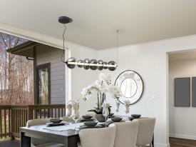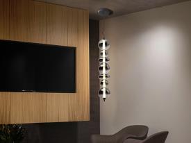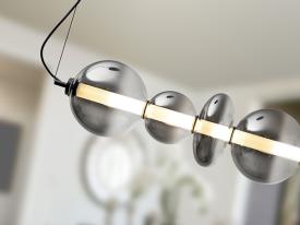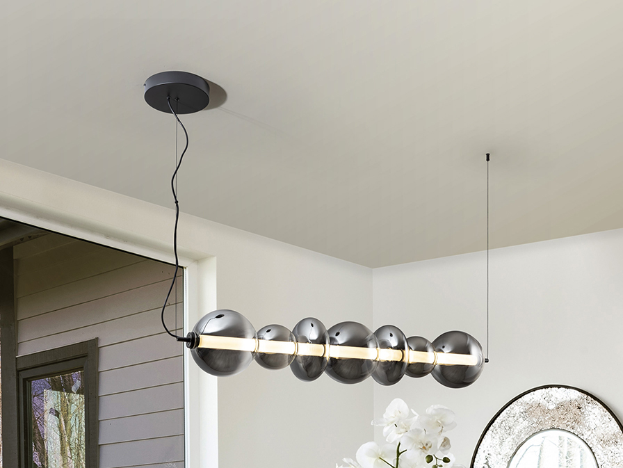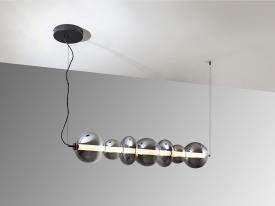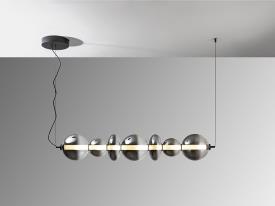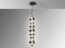Lampe en métal, fini noir mat, avec cylindre intérieur en opale et tulipes en verre soufflé, finition gris fumé délavé à transparent. Réglable en hauteur. Permet l’installation en position horizontale et verticale. 24W LED, 4000 lm, 3000 K.