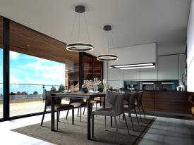 Lampe en métal et aluminium, finition noir mat. Anneau avec diffuseur en acrylique opale. Hauteur réglable. LED 55W. 3.000K. 3.300 lm