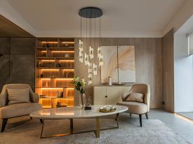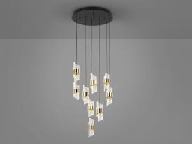 Lampe 9 lumières LED. Fabriquée en métal avec finition noir mat et or brillant. Tulipes en acrylique moulé et sculpté avec motif en spirale. Réglable en hauteur.