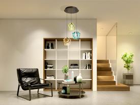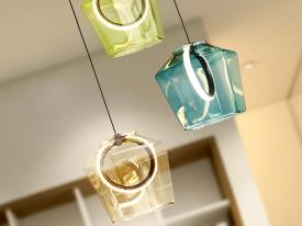 Lampe 3 lumières, en aluminium brossé, finition bronze foncé. Tulipes en verre teinté dans les tons champagne, vert et bleu, avec anneau intérieur de lumière LED et diffuseur en silicone. LED 18W, 483 lm, 3000K