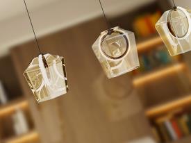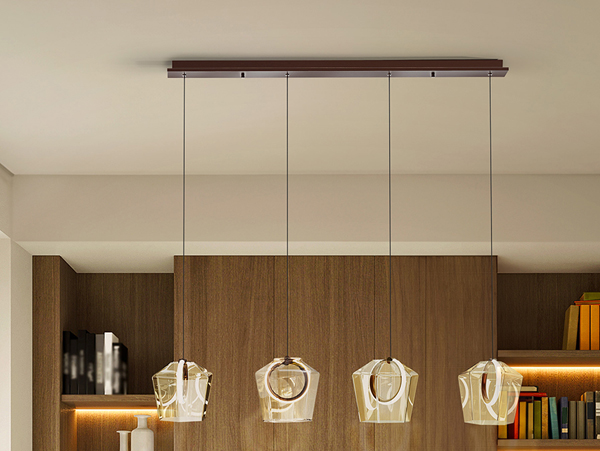 Lampe 4 lumières, en aluminium brossé, finition bronze foncé. Tulipes en verre teinté dans les tons champagne, avec anneau intérieur de lumière LED et diffuseur en silicone. LED 24W, 644 lm, 3000K