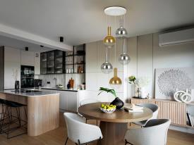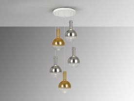 Lampe en métal, finition blanc mat. Tulipes en verre soufflé Ø20 cm, couleur gris fuméee miroitant et or miroitant . Hauteur réglable. LED 30W, 2408 lm, 3000K.