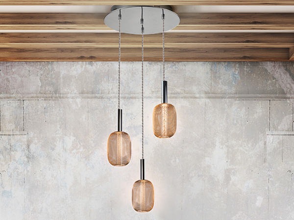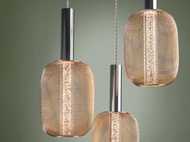 Lampe LED 3 lumières réalisée en métal chromé. Double tulipe avec cylindre intérieur en acrylique transparent avec bulles et ovale extérieur en maille métallique or brillant. 15W LED, 1350 lm, 3.000 K. DIMMABLE.