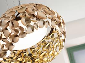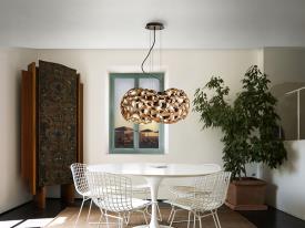 Lampe 5 Lumières réalisée en métal avec bain d’or et peinture marron foncé. Diffuseur acrylique intérieur. Réglable en hauteur.
