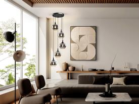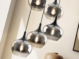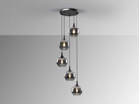 Lustre 5 lumières, en métal, finition noir mat. Abat-jour Ø19 cm en verre moulé dégradé fumé. Réglable en hauteur.