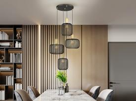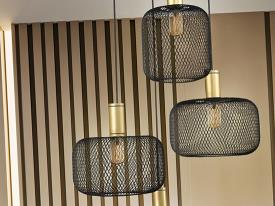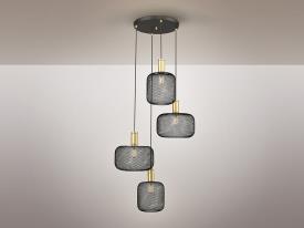 Lampe ronde 4 lumières en métal, comprenant 2 modèles de tulipes en maille métallique. Finition en peinture or et noir mat. Câble à gaine textile noire.