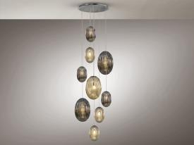 Lampe 9 lumières, réalisée en métal finition chrome. Tulipes combinées : grandes et petites. Deux tons pour le verre : cognac et gris smoke miroitant. Réglable en hauteur. NON DISPONIBLE POUR LE TERRITOIRE FRANÇAIS. EXCLUSIVITÉ XXL COMPANY.
