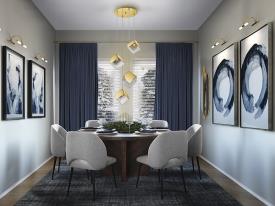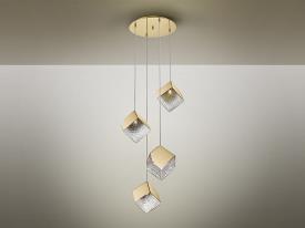 Lampe ronde 4 lumières, en métal et acier, finition dorée. Tulipe cubique en verre texturé. Réglable en hauteur.
