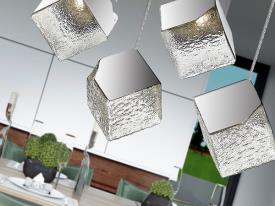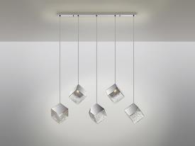 Lampe 5 lumières, en métal et acier, finition chromée. Tulipe cubique en verre texturé. Réglable en hauteur.