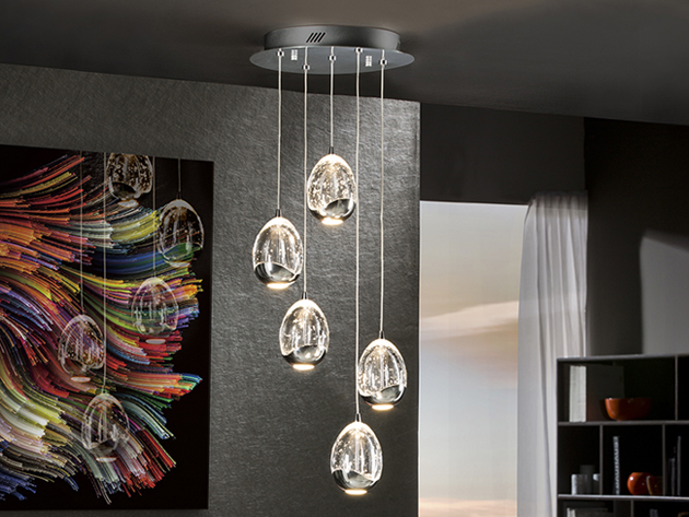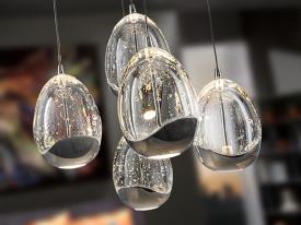 Pendante éclairage LED, en métal finition chrome. Tulipes en forme de goutte, faites en verre massif avec des bulles décoratives à l'intérieur. Réglable en hauteur. 25W LED. 2.400 lumens. 3.000K.