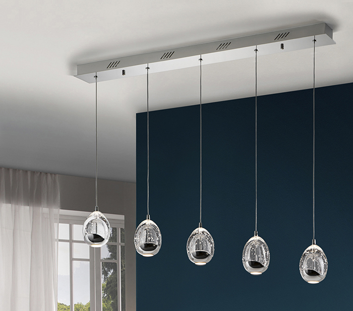 Lampe à éclairage LED, réalisée en métal finition chrome. Tulipes en forme de goutte en verre massif avec bulles décoratives à l’intérieur. Réglable en hauteur. 25W LED. 2.400 Lumen. 3.000K. DIMMABLE.
