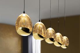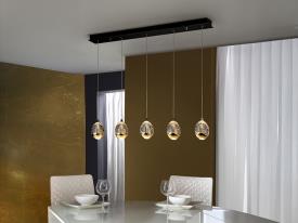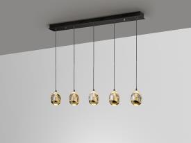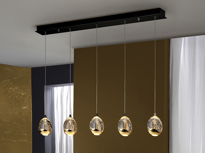 Lampe 5 LED, en métal, finition noir mat et or brillant. Tulipes en forme de goutte en verre massif avec bulles décoratives à l'intérieur, couleur champagne. Réglable en hauteur. LED DE 25W. 2400 lm. 3000 K. DIMMABLE.