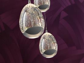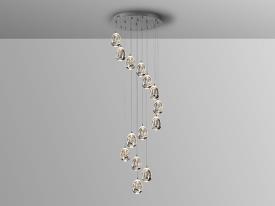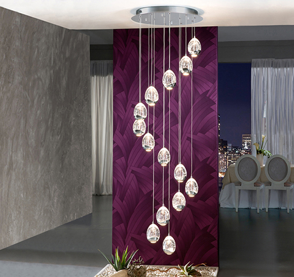 Lampe de 14 lumières LED. Réalisée en métal finition chrome. Tulipes en forme de goutte en verre massif avec bulles décoratives à l’intérieur. Réglable en hauteur. DIMMABLE par BLUETOOTH avec APP pour smartphone.70W LED, 6.720 lm, 3.000 K