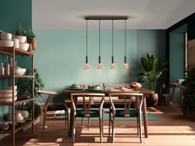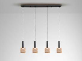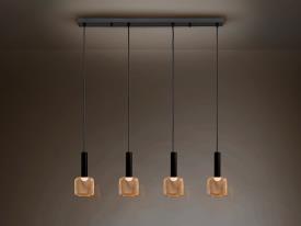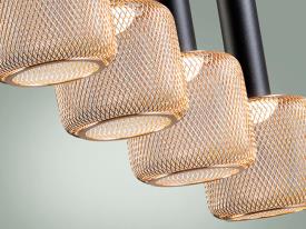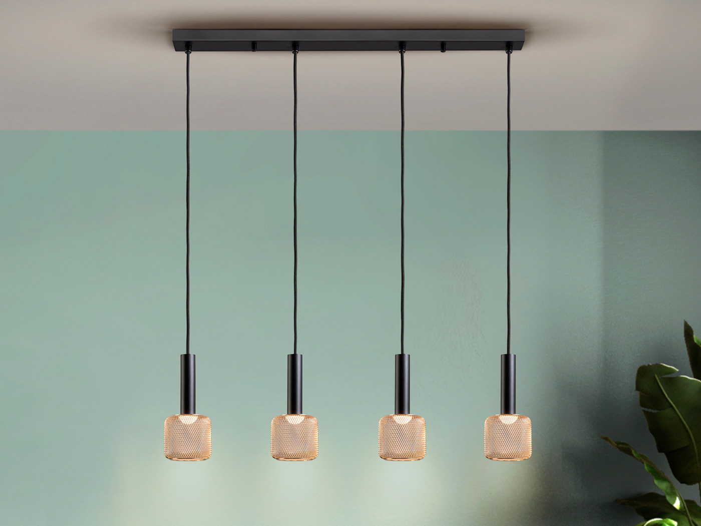 Lampe LED 4 lumières réalisée en métal noir mat et tulipe en maille métallique reflet or, diffuseur en acrylique opale. LED 20W, 1 800 lm, 3 000 K. DIMMABLE.