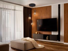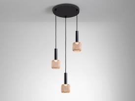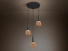 Lampe LED 3 lumières réalisée en métal noir mat et tulipe en maille métallique reflet or, diffuseur en acrylique opale. LED 15W, 1 350 lm, 3 000 K. DIMMABLE.