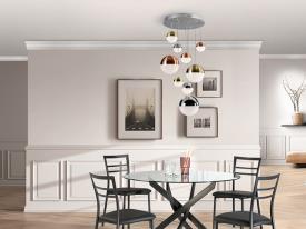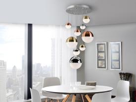 Lampe 9 lumières LED, réalisée en métal finition chromée. Tulipes sphériques de Ø10 cm, 12Ø cm, Ø20 cm, en polycarbonate avec intérieur texturisé et en métal, finition cuivre et laiton satinés et chromés. Hauteur ajustable. 54W LED. 3.000K. 3.780 lm.