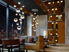 Lampe 14 lumières LED, réalisée en métal finition chromée. Tulipes sphériques de Ø10 cm, Ø12 cm,Ø20 cm, de polycarbonate avec intérieur texturisé et en métal finition en cuivre et en laiton satinés et chromés. Hauteur ajustable. 78,6W LED. 3.000K. DIM