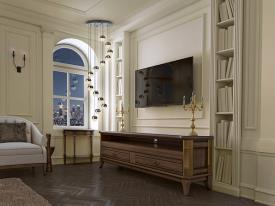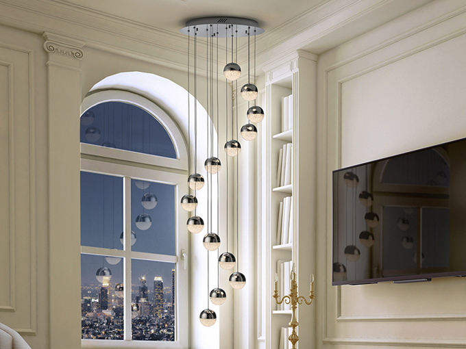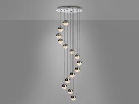 Lampe de 14 lumières LED. Réalisée en métal finition chrome. Tulipes sphériques de Ø10 cm, en polycarbonate avec intérieur texturisé et métal chromé. Réglable en hauteur. DIMMABLE par BLUETOOTH avec APP pour smartphone. 50W LED. 3.000K. 3.024 lm.