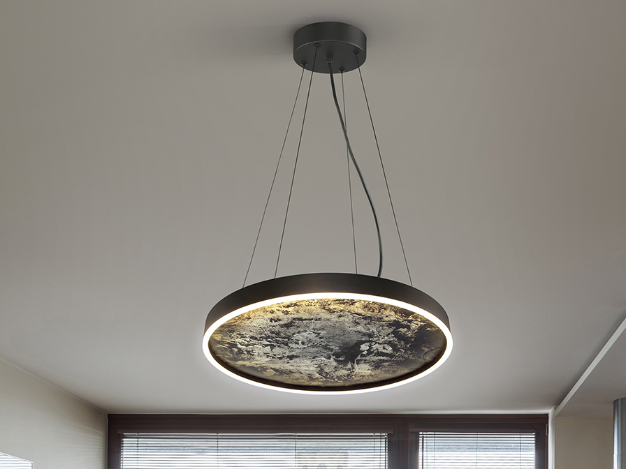 Lampe en métal, finition en noir, diffuseur en ardoise multicolore translucide, avec anneau en acrylique opale. Réglable en hauteur. Lampe LED 60+35W, 1354 lm, changement de couleur CCT, 3000/4000/6000K.
