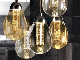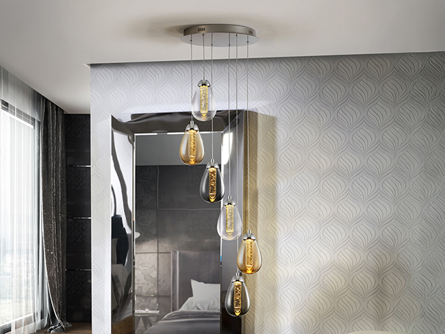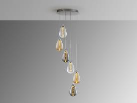 Lampe 6 lumières LED, réalisée en métal finition chrome. Double tulipe, extérieur en forme de poire réalisée en verre transparent, ambre et fumé et intérieur en barre massive avec bulles décoratives. Réglable en hauteur. 6x5W LED. 2.700lm 3.000 K.