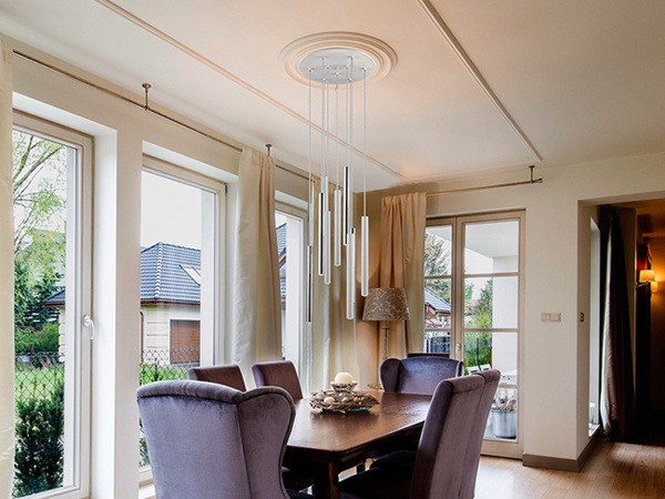 Lampe ronde 9 lumières LED. Réalisée en métal finition chrome et blanc mat. Diffuseur acrylique opale. 45W LED, 4.050 lm, 3.000 K. DIMMABLE