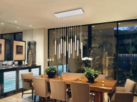 Lampe 14 lumières LED. Réalisée en métal finition or brillant et blanc mat. Diffuseur acrylique opale. 70W LED, 6.300 lm, 3.000 K. DIMMABLE. Inclut télécommande.