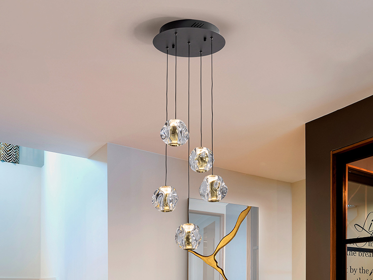 Lampe 5 lumières, en métal finition noir mat avec détails dorés et tulipes en acrylique transparent. LED 21W, 1456 lm, 3000K. Inclut le driver TRIAC et le SET DIMMAGE.