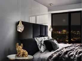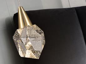 Lampe de 1 lumière LED, en métal, finition or mat. Abat-jour polyédrique en verre massif avec bulles décoratives à l'intérieur. Réglable en hauteur. LED 4W. 450 lm. 3000K