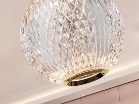 Lampe 1 lumière LED, métal finition or. Tulipe sphérique de Ø11cm en acrylique optique transparent, imitation cristal taillé. 6W LED. 3.200K. 272 lm.