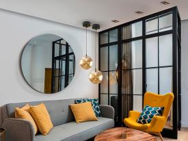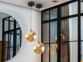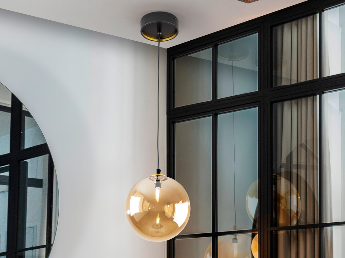 Lampe 1 lumière en métal finition noir mat, avec des détails en laiton satiné. Abat-jour en verre sphérique ambré de 20 cm.
