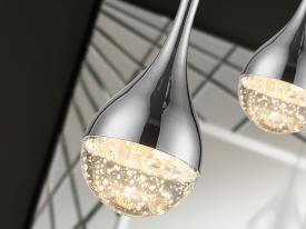 Lampe 1 lumière LED, réalisée en métal finition chrome. Tulipe en forme de goutte réalisée en cristal massif avec bulles décoratives à l’intérieur . Réglable en hauteur. 5W LED. 400 lm. 3.000 K.