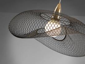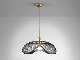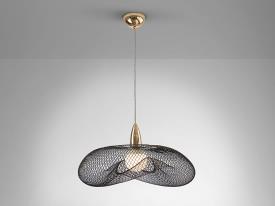 Lampe 1 lumière en métal doré brillant et tulipe en maille métallique noire.