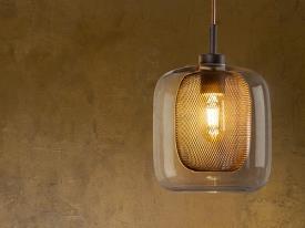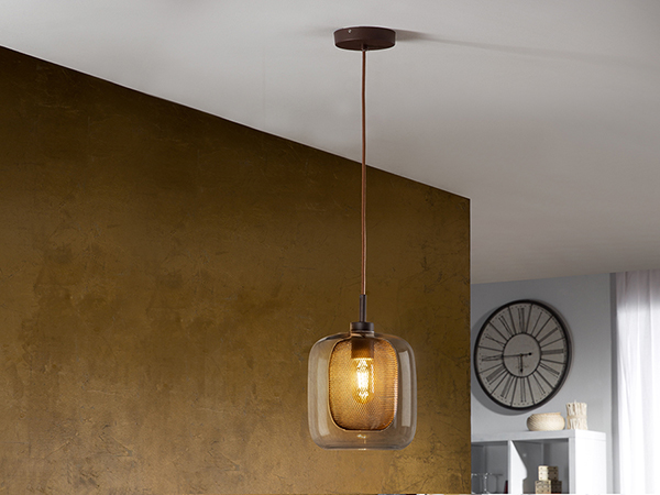 Pendante réalisée en métal laqué, couleur chocolat. Double tulipe, intérieur en maille métallique et extérieur en verre.