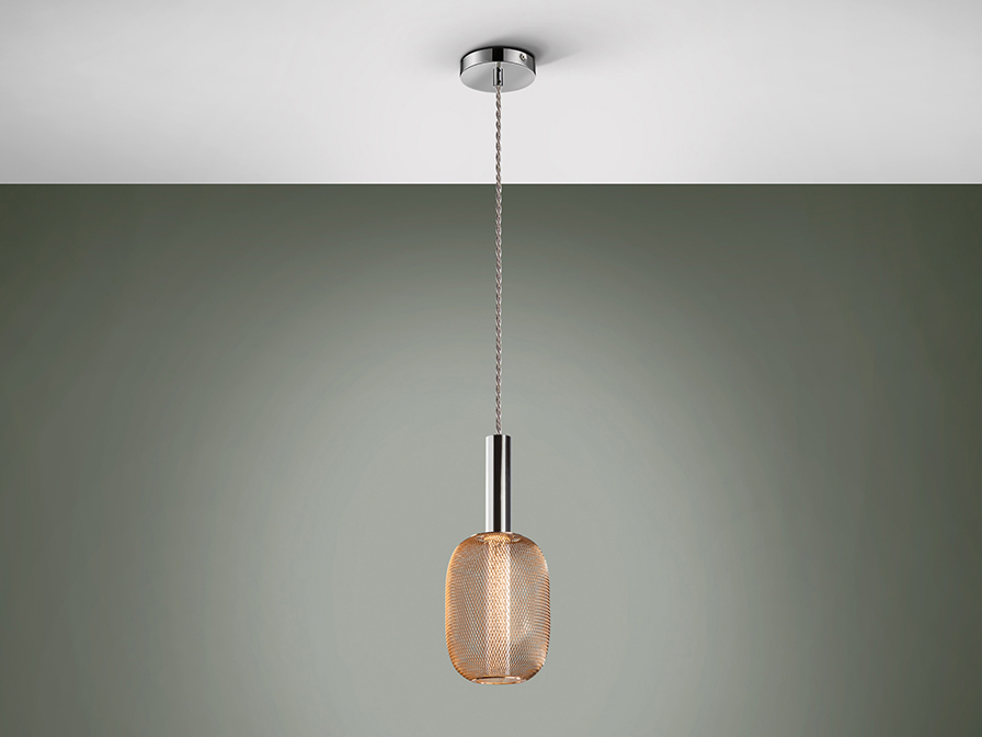 Lampe LED 1 lumière réalisée en métal chromé. Double tulipe avec cylindre intérieur en acrylique transparent avec bulles et ovale extérieur en maille métallique or brillant. 5W LED, 450 lm, 3.000 K. DIMMABLE