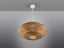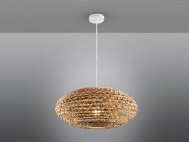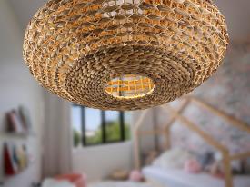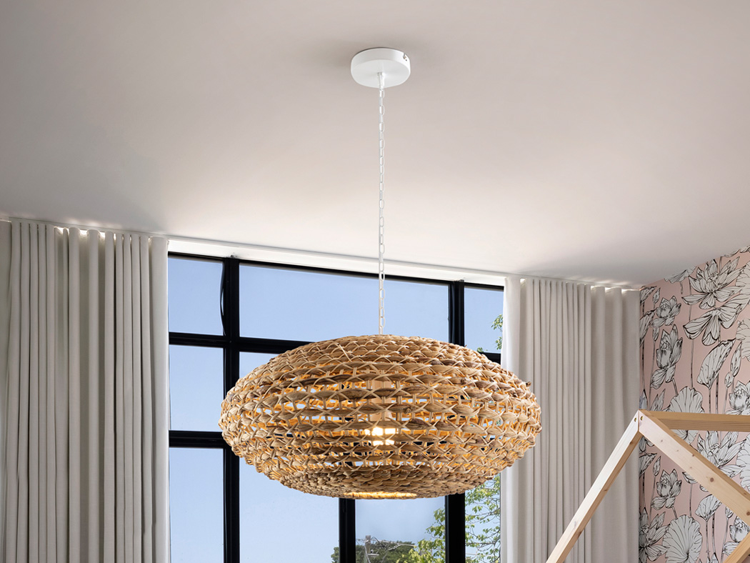Lampe 1 lumière, en métal, finition blanche. Abat-jour en fibre de rotin et jacinthe d'eau tressée, finition naturelle.