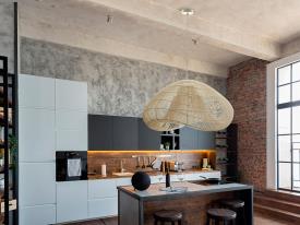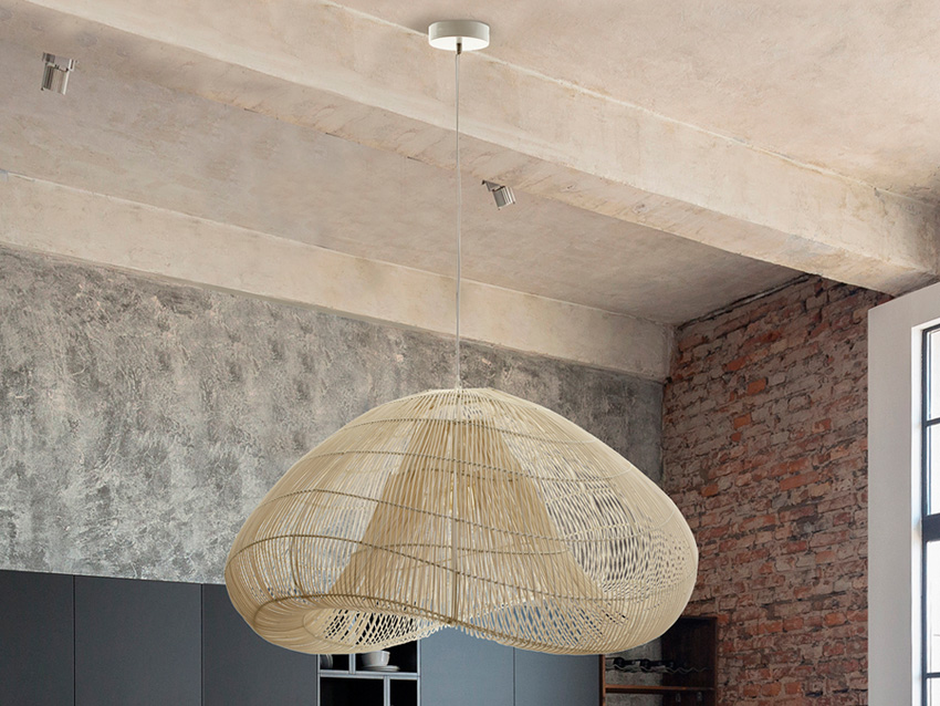 Lampe à une lumière, en métal, finition blanche. Abat-jour en rotin, finition blanche patinée.