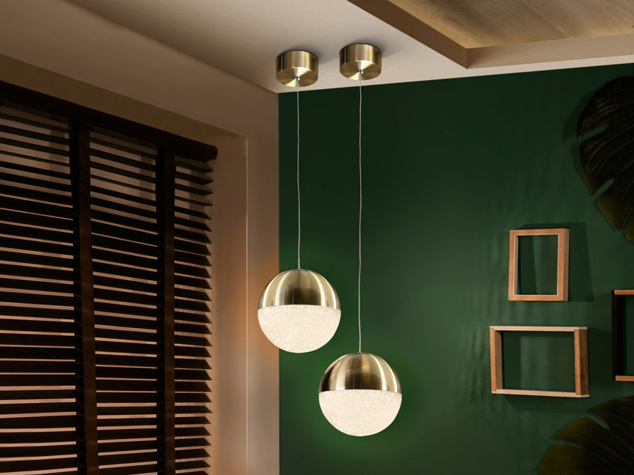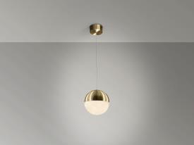 Lampe 1 lumière LED, réalisée en métal finition laiton satiné. Tulipe sphérique de Ø20 cm. en polycarbonate avec intérieur texturisé et métal chromé. Hauteur réglable. 9,6 W LED. 3.000 K. 672 lm.