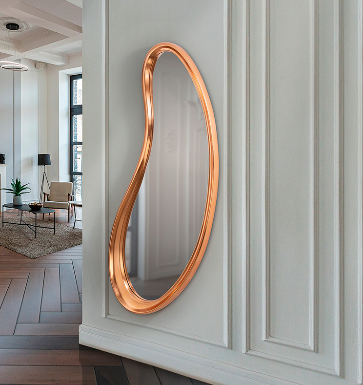 BRIGITTE- MIROIR OR ROSE Dimensions : l 67 x h 166 x p 7 cm miroir décoratif, avec cadre en polyuréthane finition PAIN D'OR rose. Matériau: glass, MDF, polyuréthane Finition: miroir, ROSE GOLD