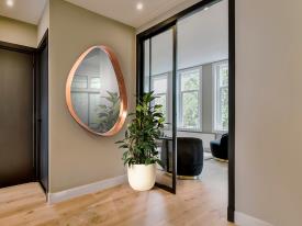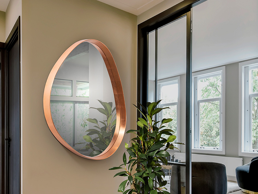 JULIE- MIROIR OR ROSE Dimensions : l 89 x h 109 x p 7,5 cm miroir décoratif, avec cadre en polyuréthane finition PAIN D'OR rose. Matériau: Miroir en verre, MDF, polyuréthane Finition: OR ROSE