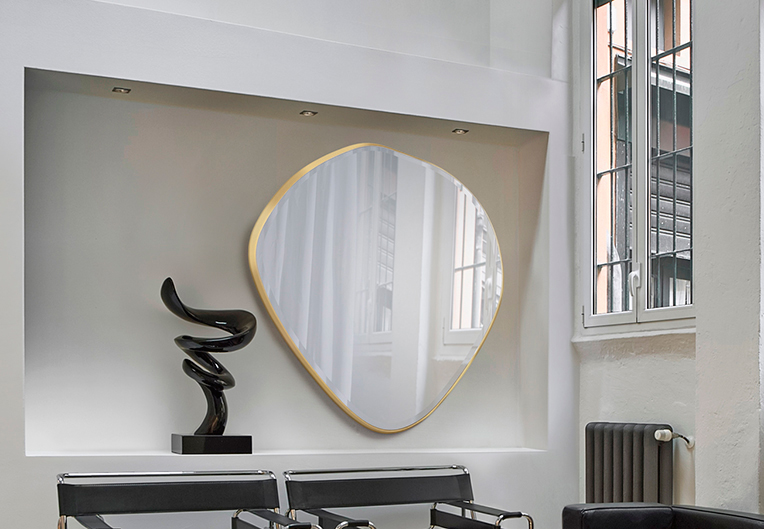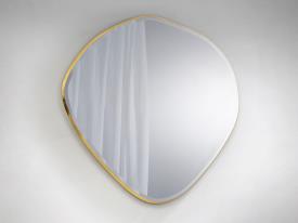 MIMO - MIROIR 110X110 OR Dimensions : l 114 x h 110 x p 4 cm miroir ovale irrégulier, avec cadre en MDF finition FEUILLE OR et glace biseautée. Matériau: Verre, MDF Finition: miroir, gold leaves