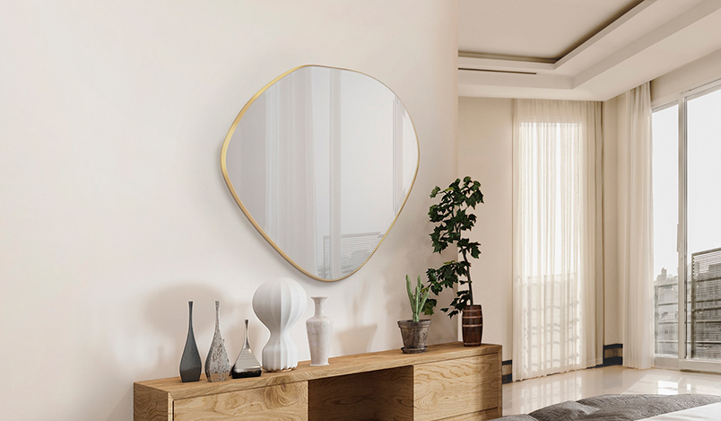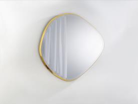 MIMO - MIROIR 80X80 OR Dimensions : l 80 x h 80 x p 4 cm miroir ovale irrégulier, avec cadre en MDF finition FEUILLE OR et glace biseautée. Matériau: Verre, MDF Finition: miroir, gold leaves