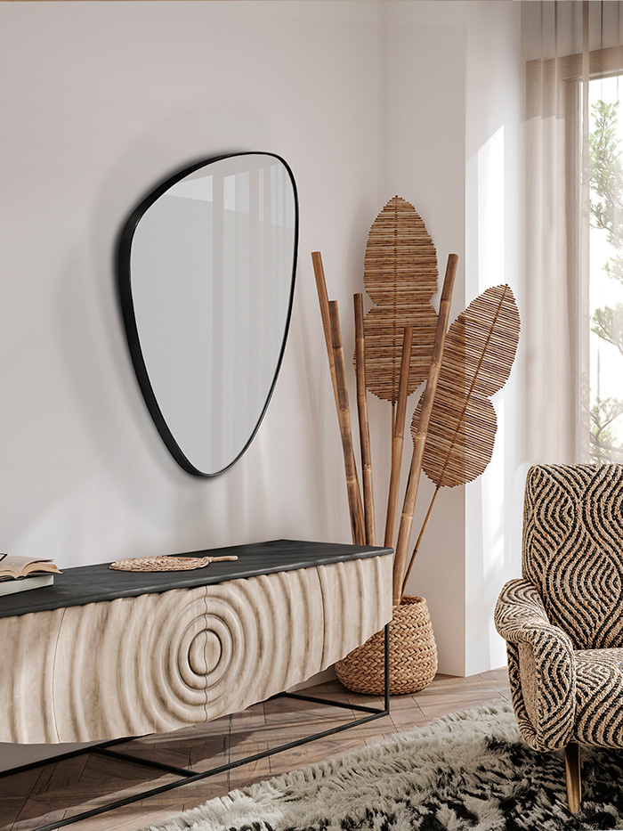 miroir triangulaire avec cadre en MDF finition noir mat. Prêt à être suspendu horizontalement ou verticalement.