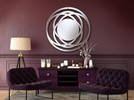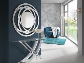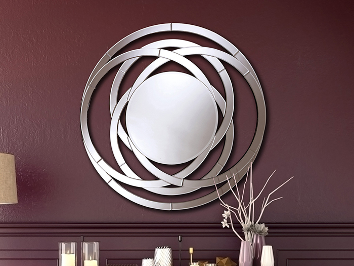 miroir avec glace centrale biseautée et cadre ajouré, en forme d'anneaux décrits par les sections courbes des glaces biseautées. Dos en MDF finition couleur noire. Préparé pour être suspendu en position horizontale ou verticale.