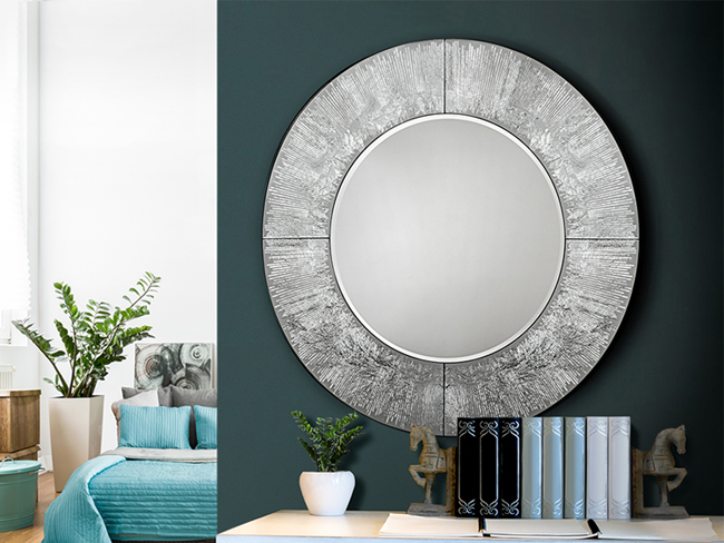 miroir rond avec glace centrale biseautée et cadre en verre avec graphisme en feuille d’argent. Dos en DM laqué en noir.