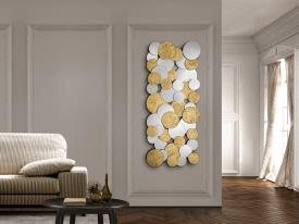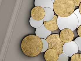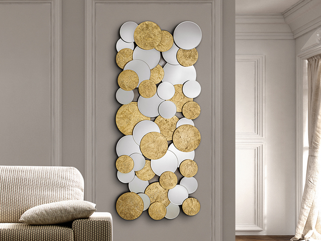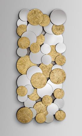 miroir formé par des sphères de glaces biseautées et verre avec fond en FEUILLE D’OR. Dos en DM laqué en noir. Préparé pour suspendre en position horizontale ou verticale.