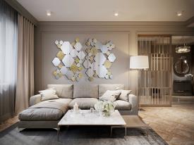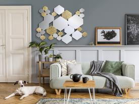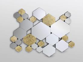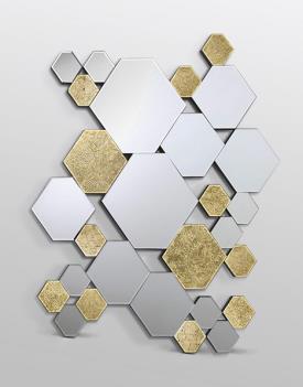 miroir formé d'hexagones de lunes et de cristaux avec un fond en GOLDEN PAN, biseauté. Dos en MDF laqué noir. Prêt à accrocher en position horizontale ou verticale.