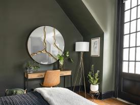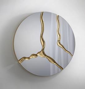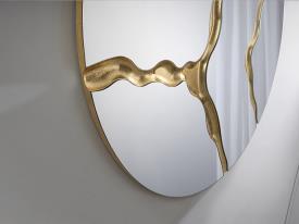SURCOS- MIROIR FEUILLE OR D100 Dimensions : ø 100 x p 2,4 cm miroir rond avec fente décorative, base en MDF, finition FEUILLE OR. Matériau: Glass, MDF Finition: Mirror, GOLD LEAVES