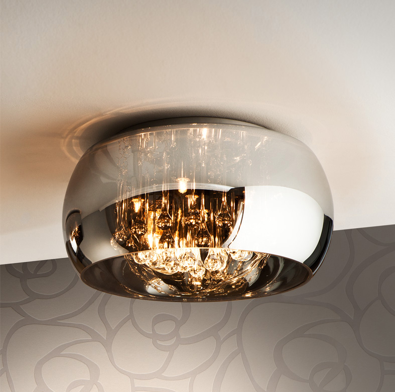 Plafonnier en métal finition chrome. Tulipe en verre sans tain. Larmes intérieures en verre type Murano. DIMMABLE. Télécommande incluse.